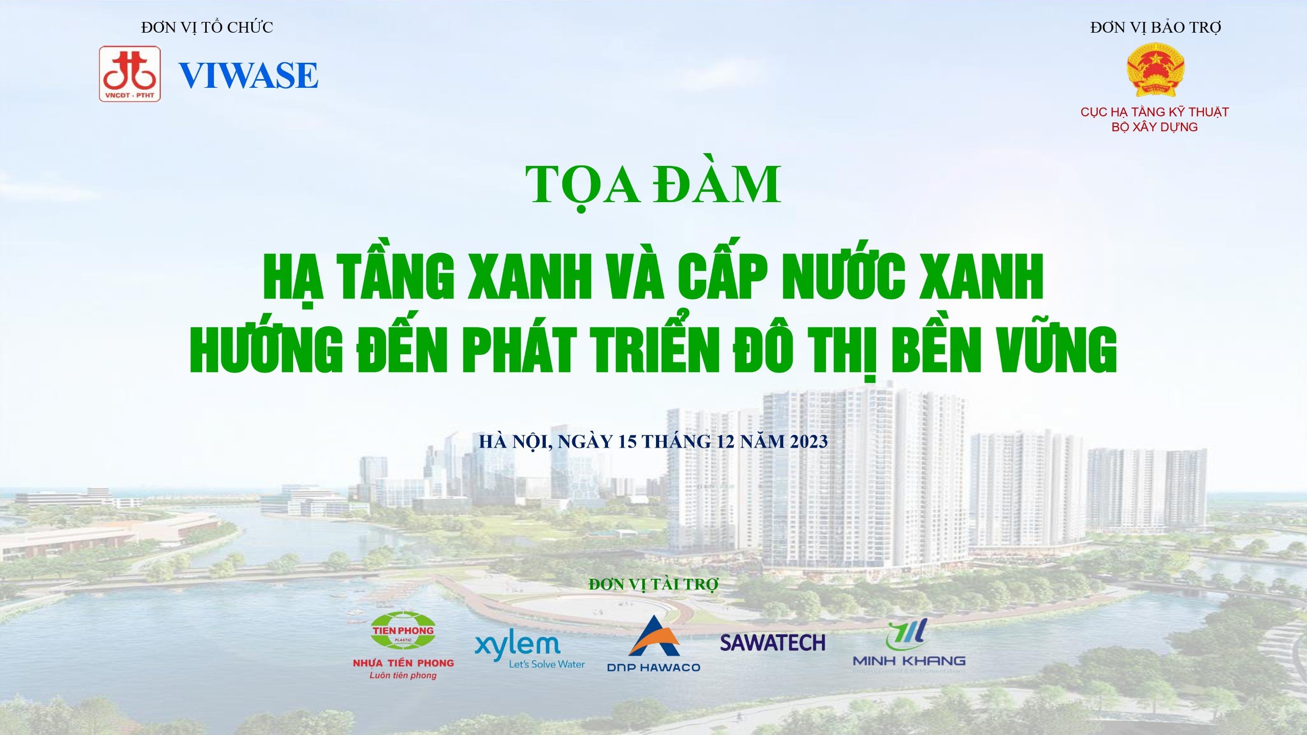 Ngày 15/12/2023, Công ty Cổ phần Nước và Môi trường Việt Nam (VIWASE) phối hợp với Viện Nghiên cứu đô thị và Phát triển hạ tầng (IUSUID) dưới sự bảo trợ của Cục Hạ tầng kỹ thuật – Bộ Xây dựng, đã tổ chức buổi Tọa đàm “Hạ tầng xanh và Cấp nước xanh - Hướng đến phát triển đô thị bền vững”. Tham dự Tọa đàm có đại diện Cục Hạ tầng kỹ thuật, Cục Phát triển đô thị Bộ Xây dựng, Hội Cấp thoát nước, Hội Quy hoạch đô thị Việt Nam, Hội Môi trường Xây dựng Việt Nam, Viện Quy hoạch đô thị và Nông Thôn Quốc gia, Viện Khoa Học Thủy Lợi, các trường Đại học Xây Dựng Hà Nội, Đại học Kiến Trúc Hà Nội, Đại học Thủy lợi, Đại học Kinh doanh công nghệ, đại diện các công ty cấp nước và các nhà đầu tư, đại diện một số doanh nghiệp trong lĩnh vực cấp thoát nước, các phóng viên báo chí chuyên ngành.